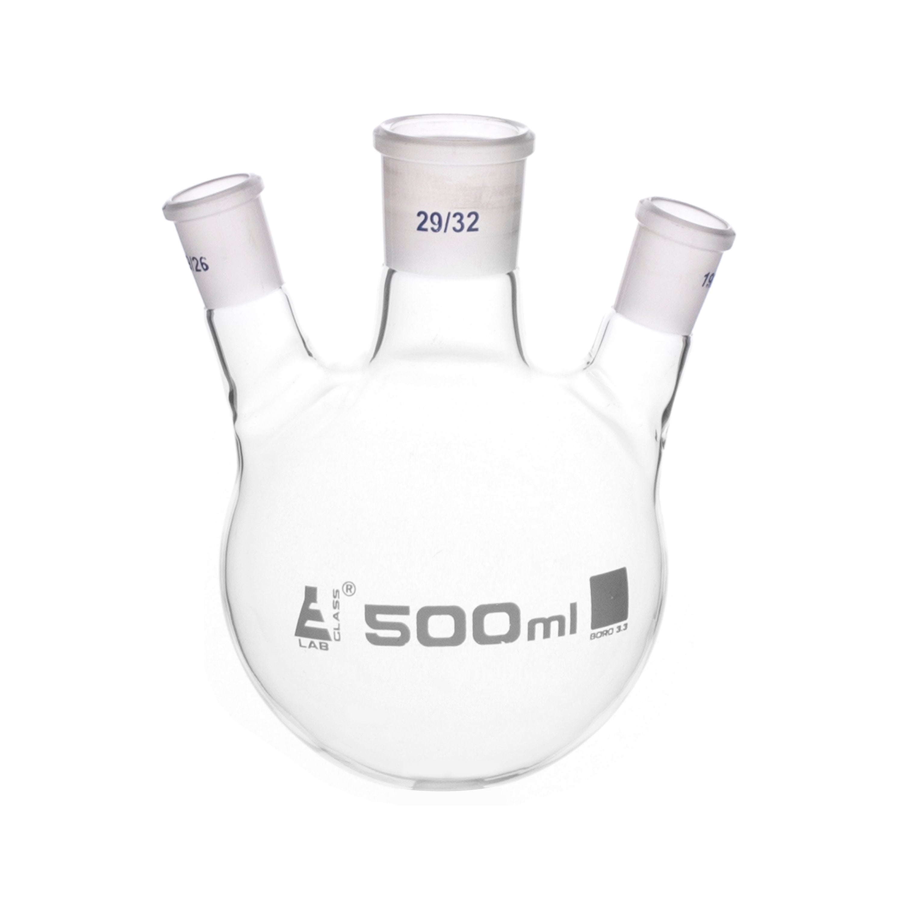Borosilicate Glass 3 Neck Distillation Flask, 500ml, 29/32 Oblique Neck, 19/26 Side Joint, Autoclavable