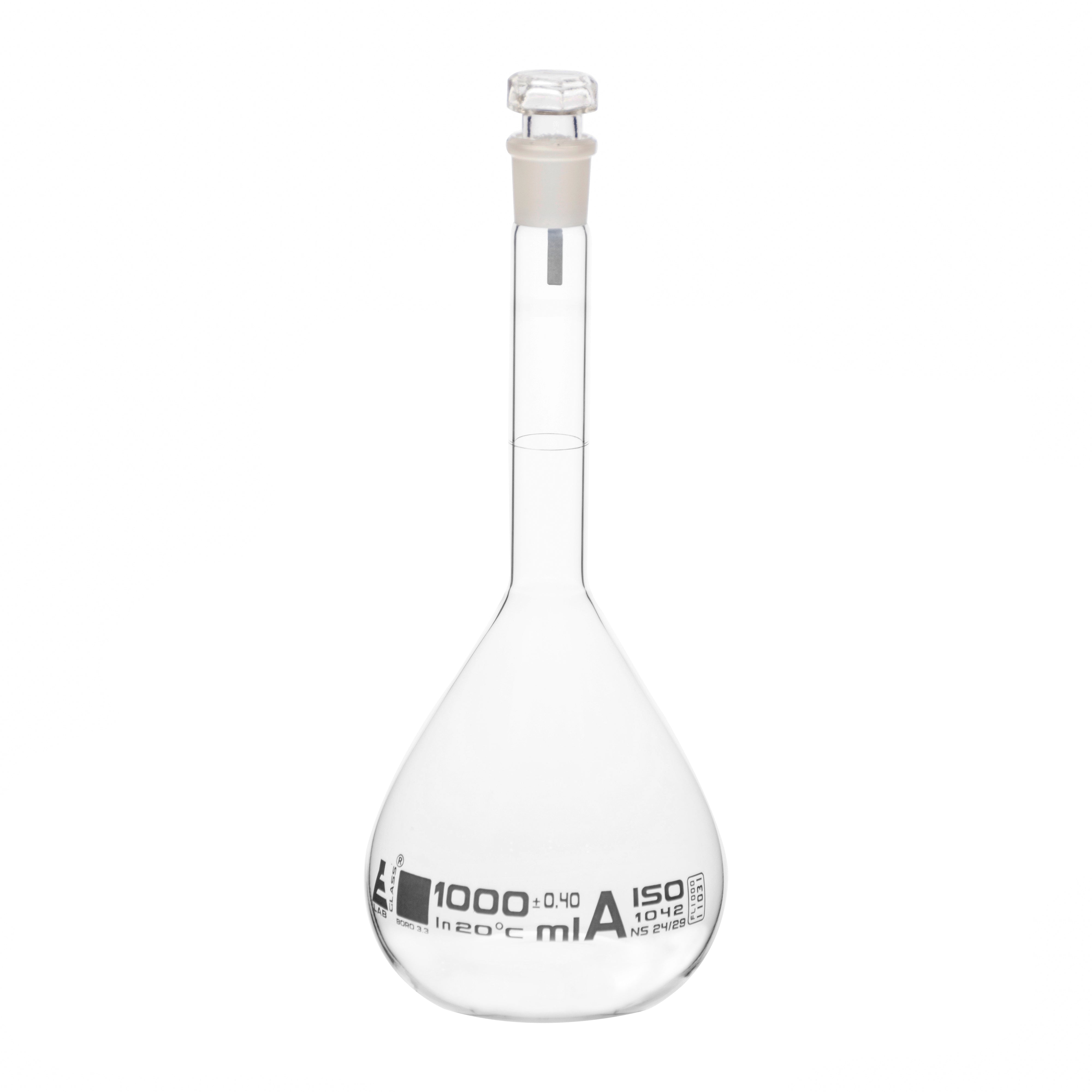 Borosilicate Volumetric Flask with Hollow Glass Stopper, 1000ml, Class A, White Print, Autoclavable