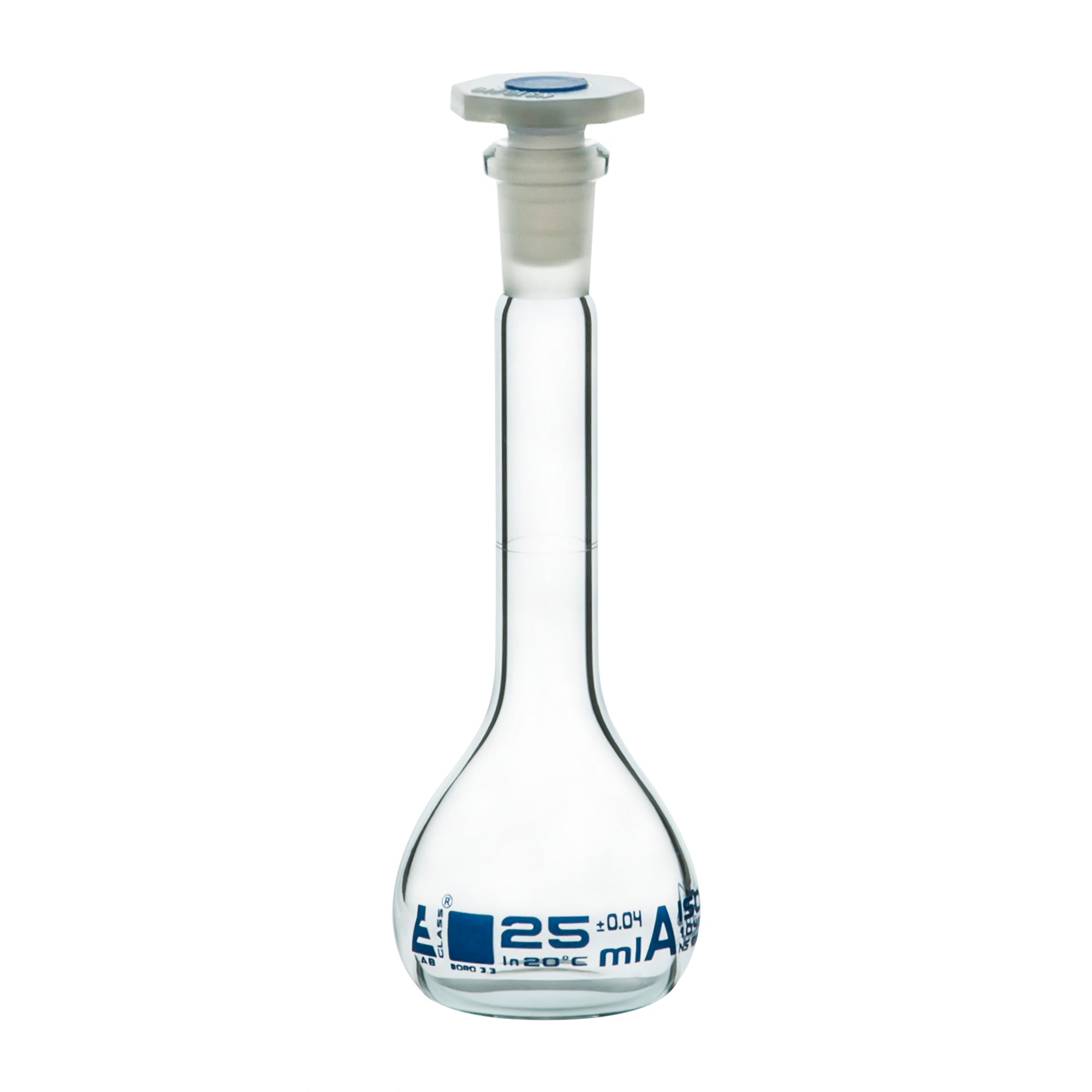 Borosilicate Glass Volumetric Flask with Polyethylene Stopper, 25ml, Class A, Blue Print, Autoclavable