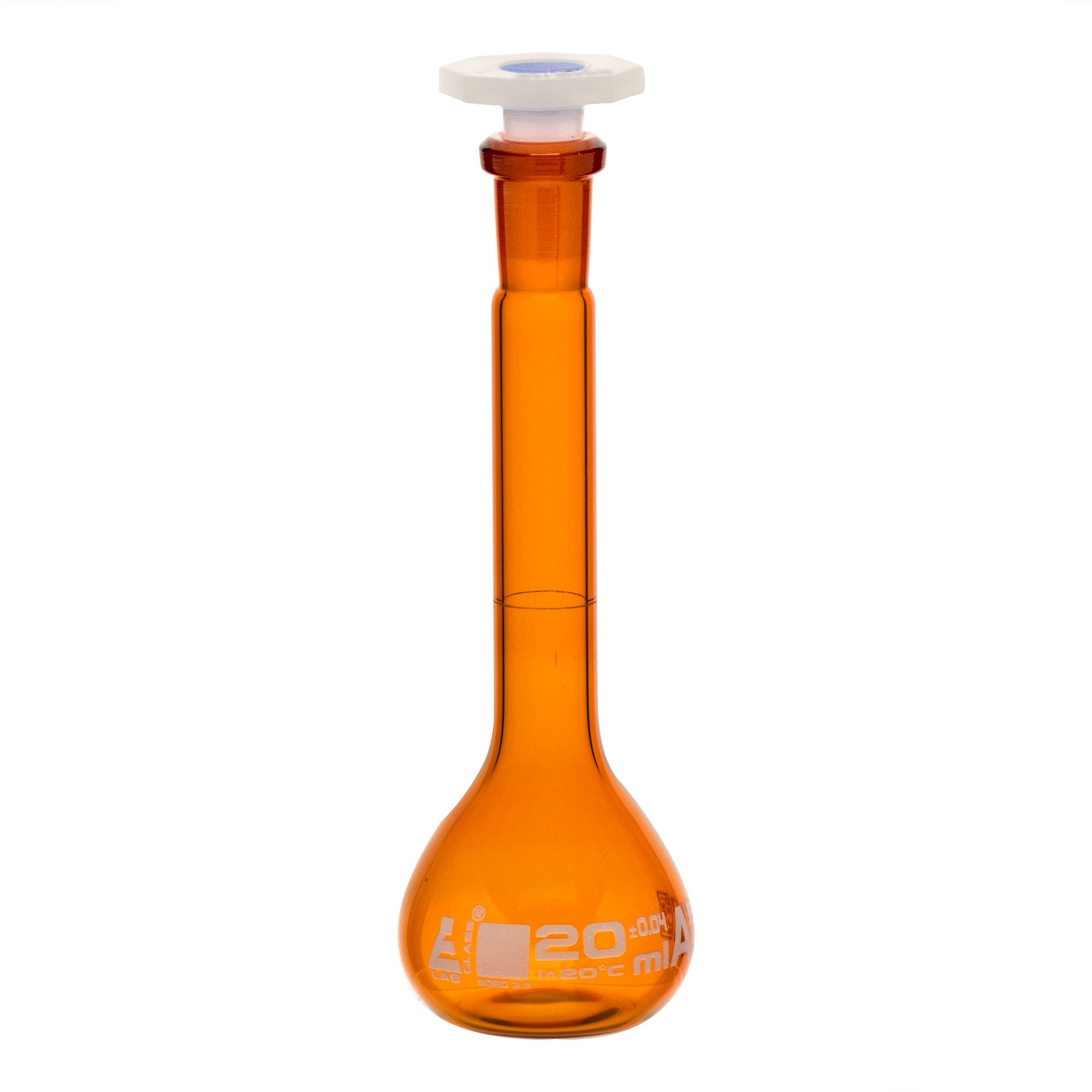 Amber Borosilicate Glass Volumetric Flask with Polypropylene Stopper, 20 ml, Class A with Individual Work Certificate, Pack of 2, Autoclavable